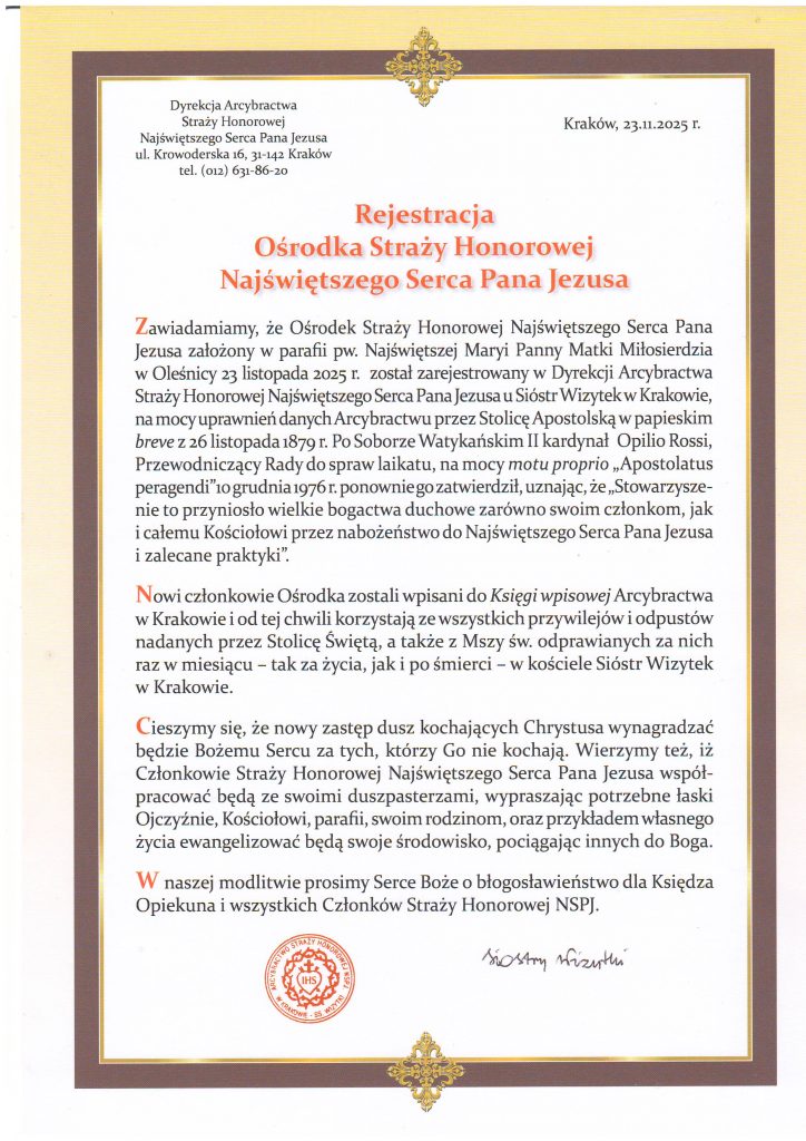 23 listopada podczas Mszy Świętej o godz. 12.00 zostało oficjalnie zainaugurowana wspólnota Arcybractwa Straży Honorowej NSPJ. W czasie uroczystej Eucharystii swoje przyrzeczenia czci, miłości i wynagrodzenia NSPJ złożyło 10 sióstr. Spotkania odbywają się w Pierwsze Piątki Miesiąca o godz. 19.00 w kaplicy Św. Franciszka, wcześniej zapraszamy na Msze Świętą wynagradzającą o godz. !8.00 .